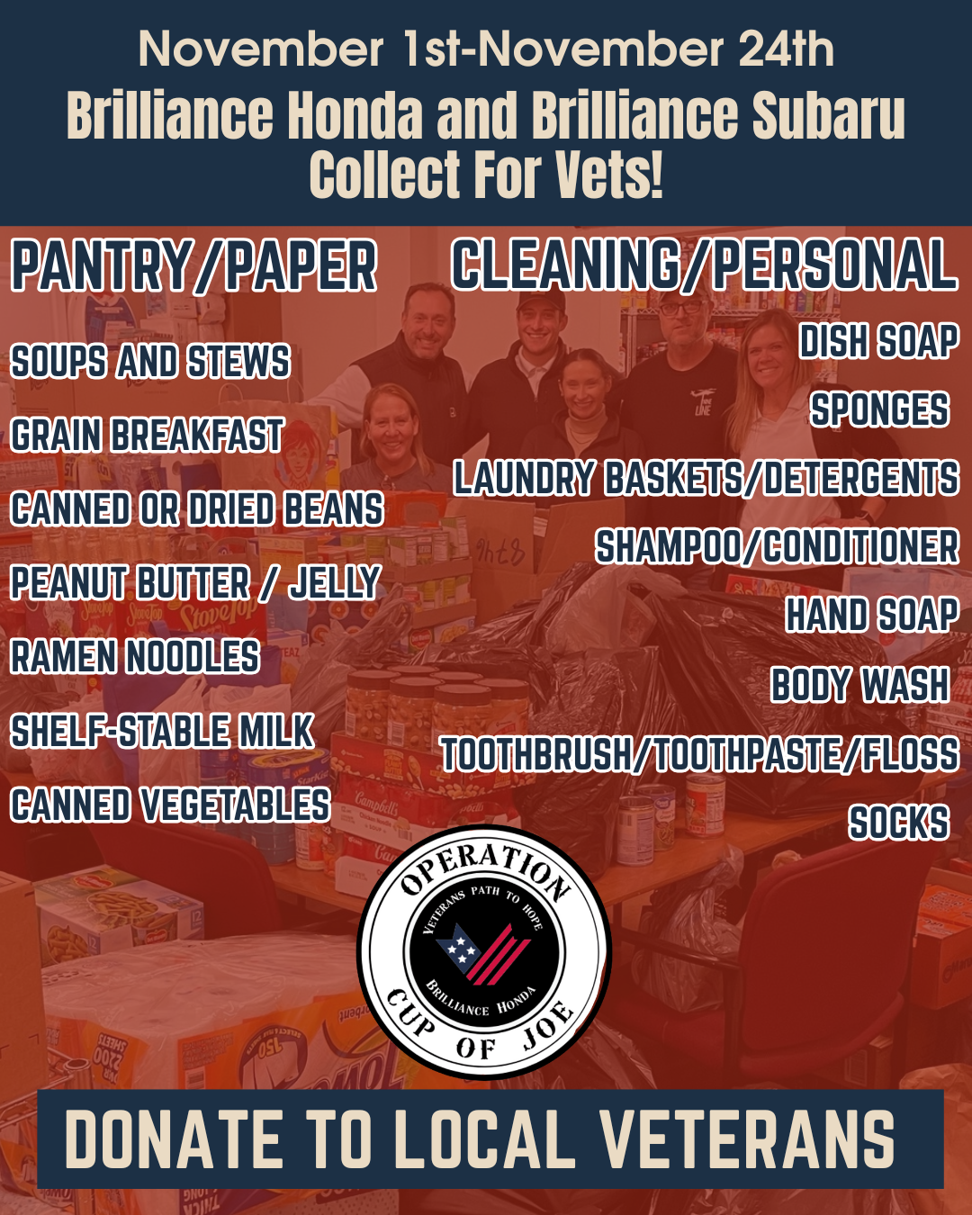 Brilliance Subaru/Brilliance Honda canned food drive for Veterans Path to Hope all November long!